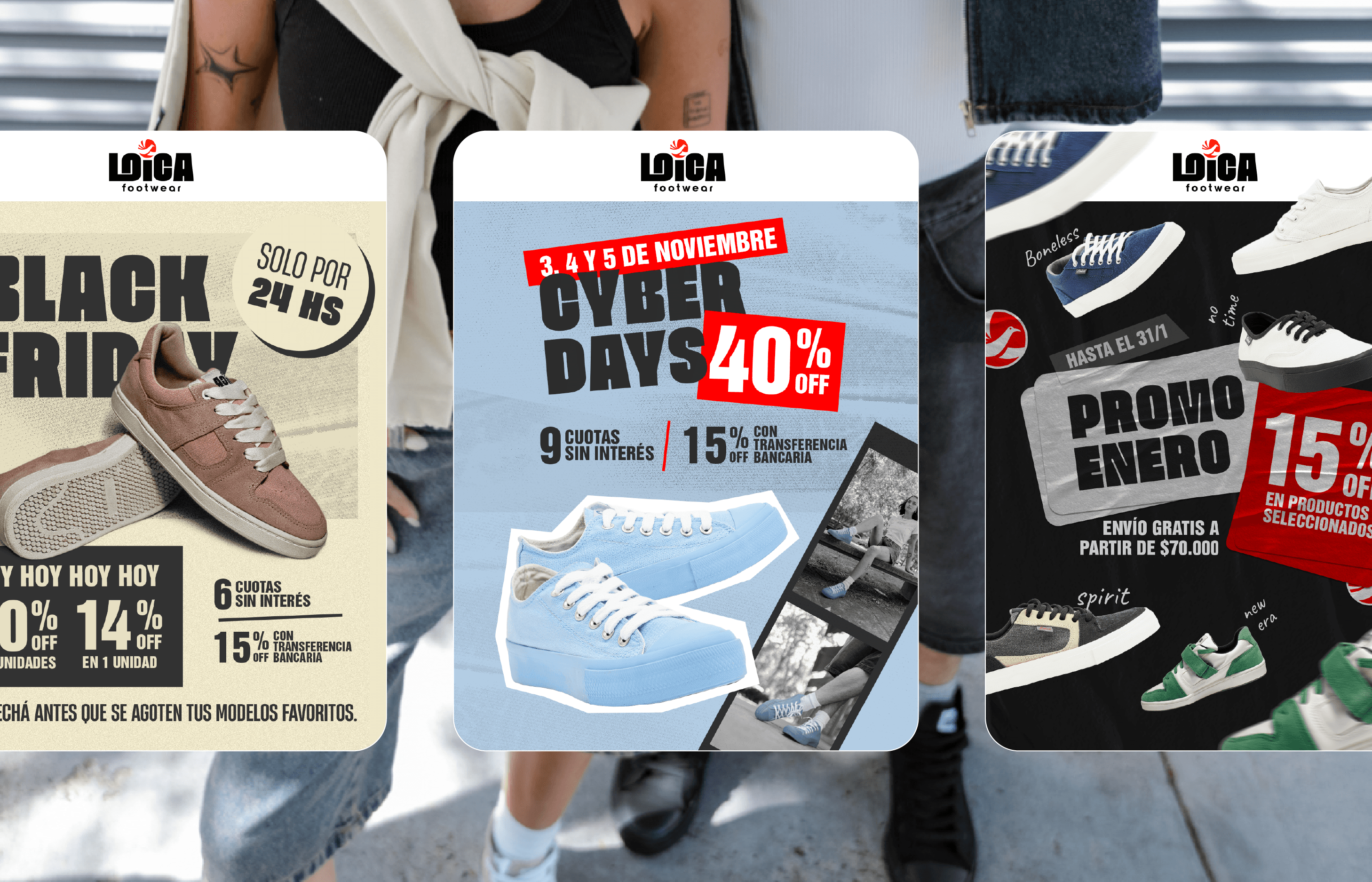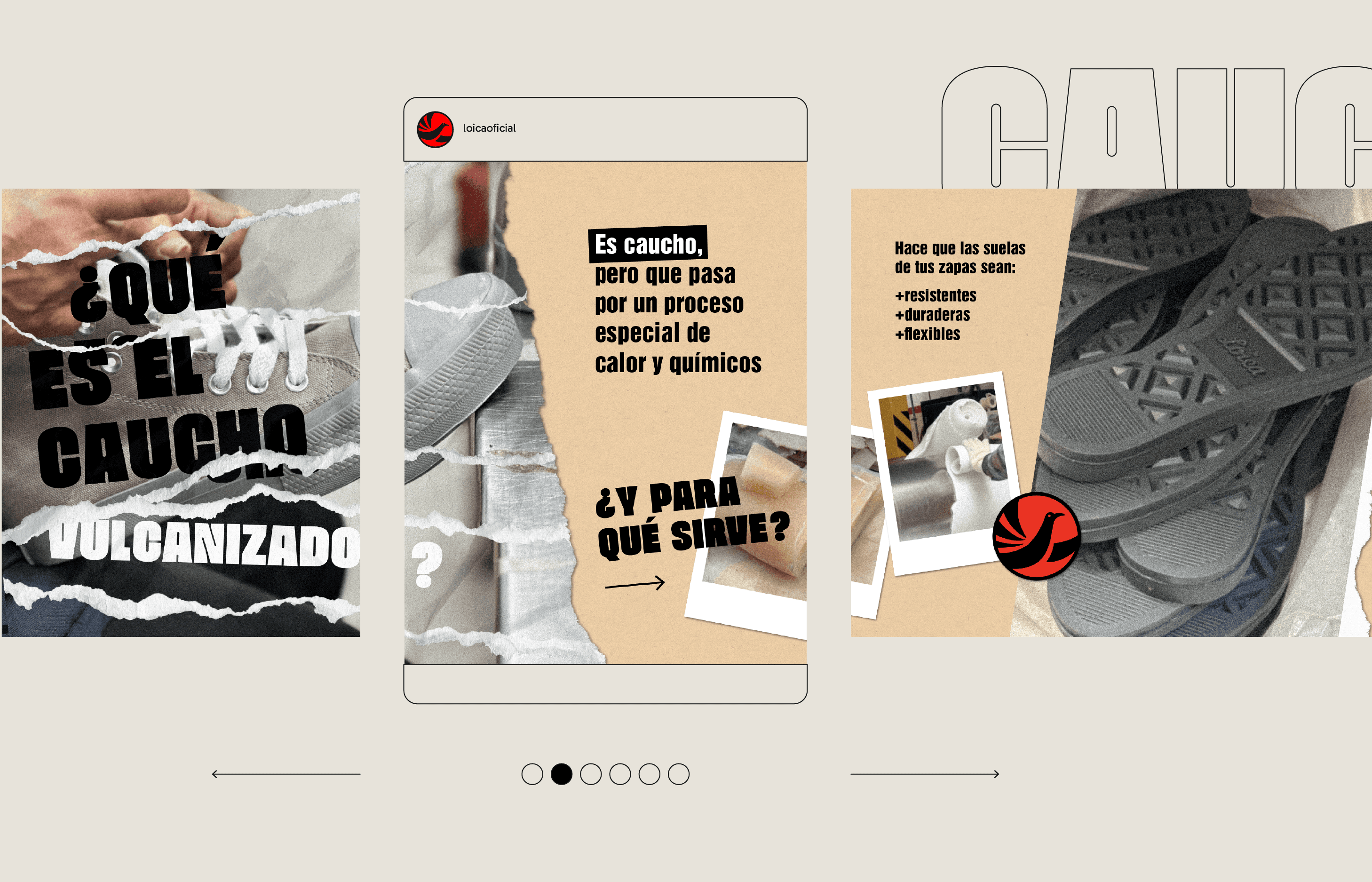 Loica is an Argentine company with over 20 years of experience in the production of vulcanized rubber footwear. The brand has a youthful identity, with an urban and nostalgic communication style. When I started working with Loica, the main challenge was to create visual elements that could help build a consistent and recognizable brand universe for its social media presence. To achieve this, I developed a visual system based on a series of textures (such as asphalt marks, paper wrinkles, and grain) along with graphic cut-outs. Combined with imagery and the brand’s typography used at large scale, these elements formed a cohesive and impactful visual language, aligned with Loica’s communication style and brand identity.